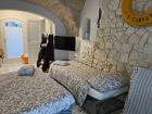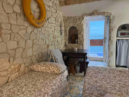 Площадь 35 кв. м, open space разделен на салон и спальную зону с двуспальным диваном, есть возможность организовать 1 - 2 дополнительных спальных места, 1 ванная комната с душем, оборудованная мини-кухня, балкон, кондиционер, отопление, интернет, отдельный вход с площади. Квартира расположена в историческом центре города в здании отеля «Гротта Палаццезе» на утесе в 25 м. над уровнем моря, с балкона открывается потрясающий вид на море и на один из самых романтических в Италии и мире – ресторан «Гротта Палаццезе». Цена изменяется в зависимости от сезона.