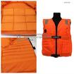 Жилет страховочный рабочий ЖСР-1 снабжен свистком с креплением и светоотражающими полосами, застегивается на молнию, имеется два регулировочных ремня, позволяющих легко подгонять жилет по фигуре человека, на полочках расположены два кармана. Изделие изготавливается под техническим наблюдением РМРС и РКО в двух размерах: 44-52 и 54-62.